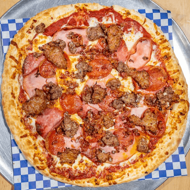 Pepperoni, salami, canadian bacon, italian sausage, smoked bacon and meatballs. Pineapple and jalapenos optional