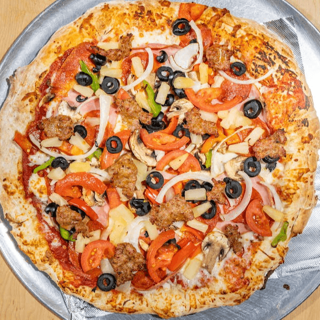 Pepperoni, canadian bacon, salami, mushrooms, green peppers, red onions, black olives, smoked bacon, tomatoes, pineapple and Italian sausage